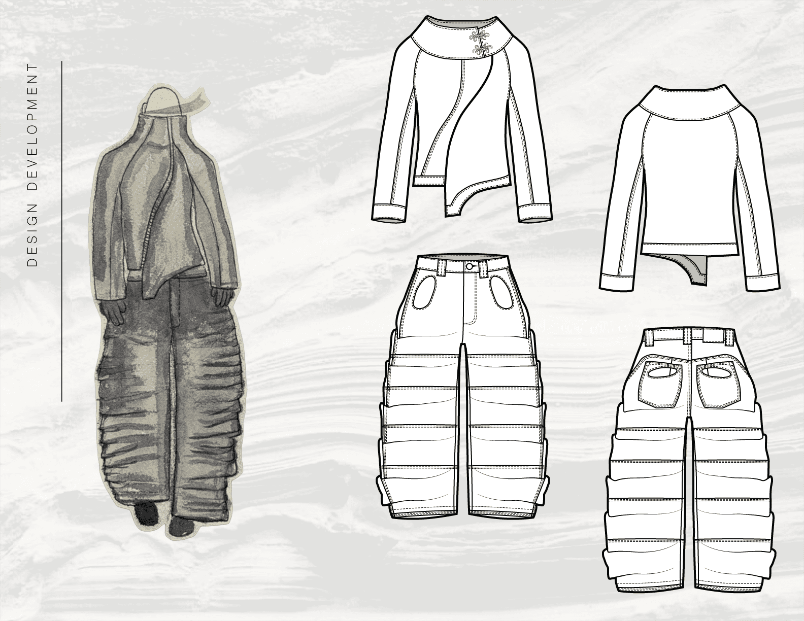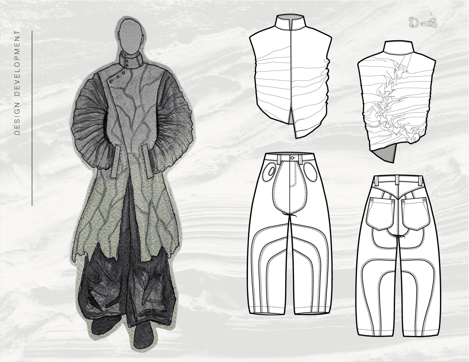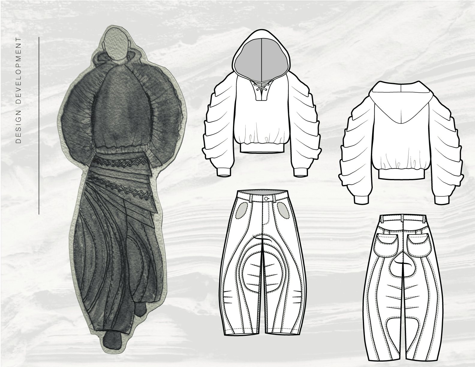 This page presents the development of Below the Surface through sketches, flats, and mood imagery. Together, these elements outline the progression of each look, from initial concept and visual references to refined silhouette, proportion, and construction.