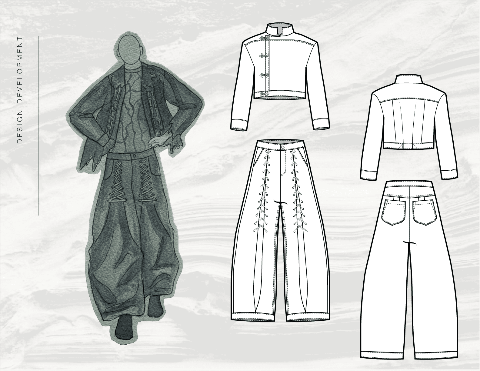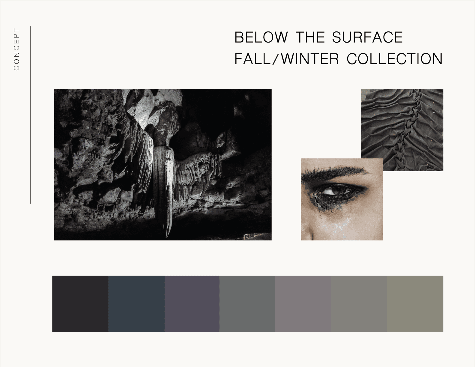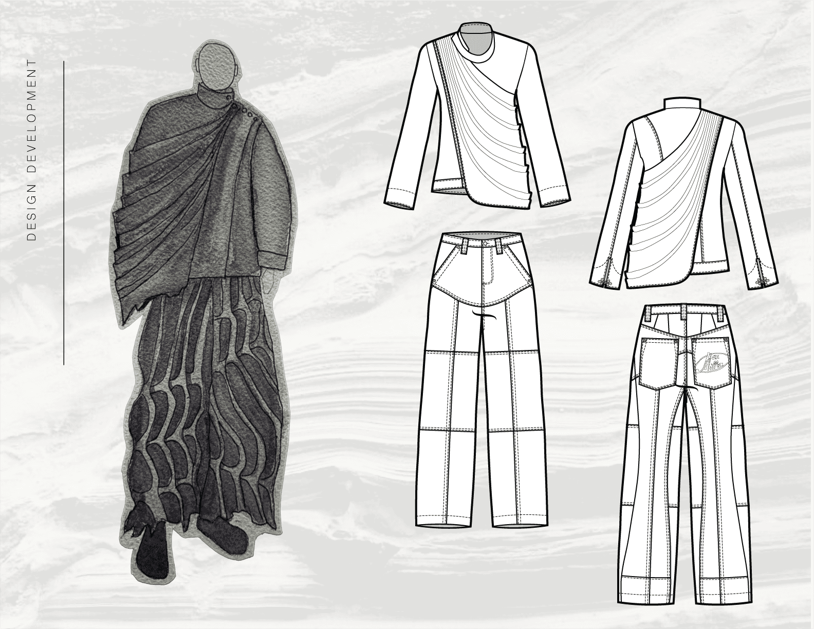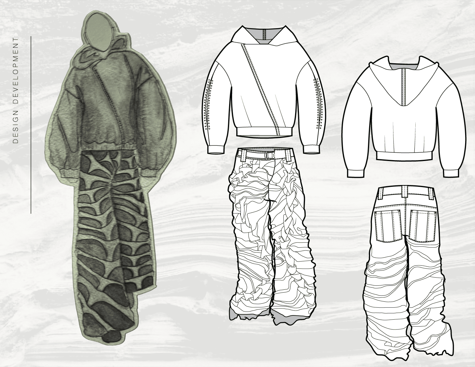 This page presents the development of Below the Surface through sketches, flats, and mood imagery. Together, these elements outline the progression of each look, from initial concept and visual references to refined silhouette, proportion, and construction.