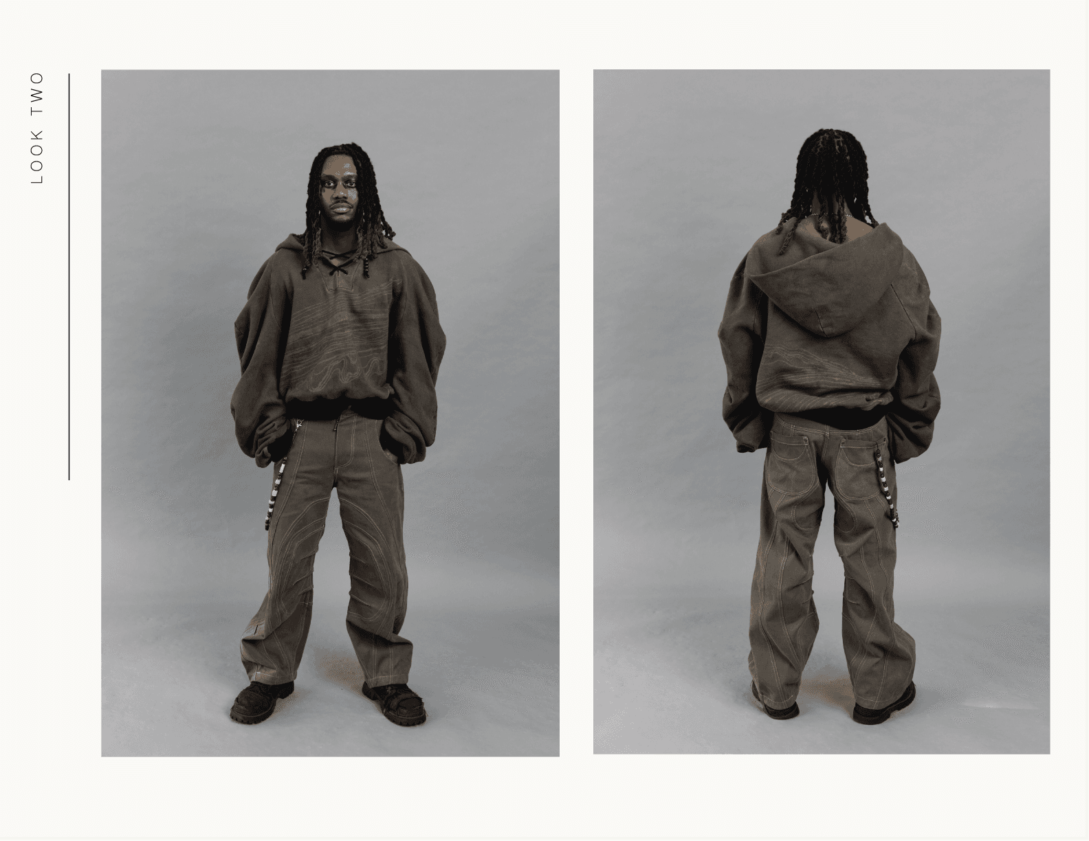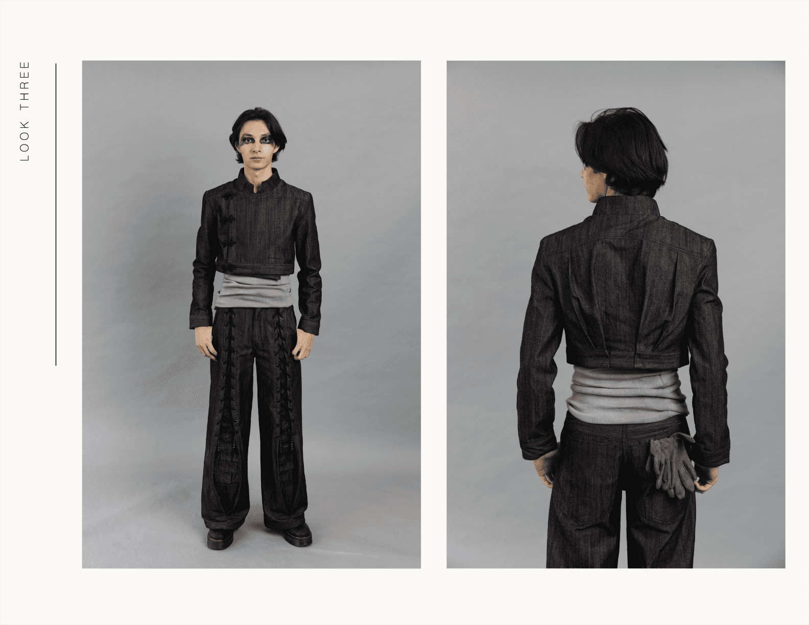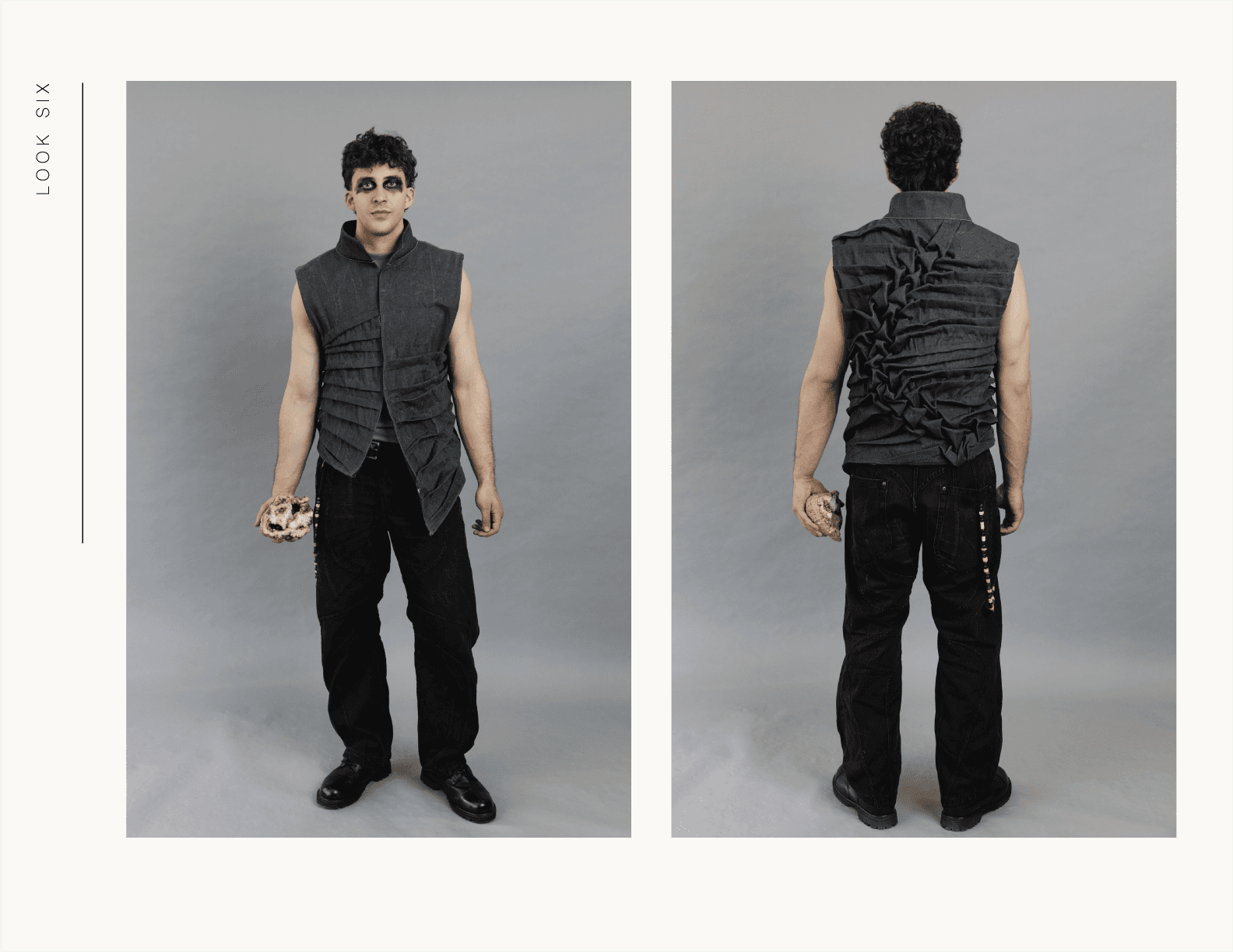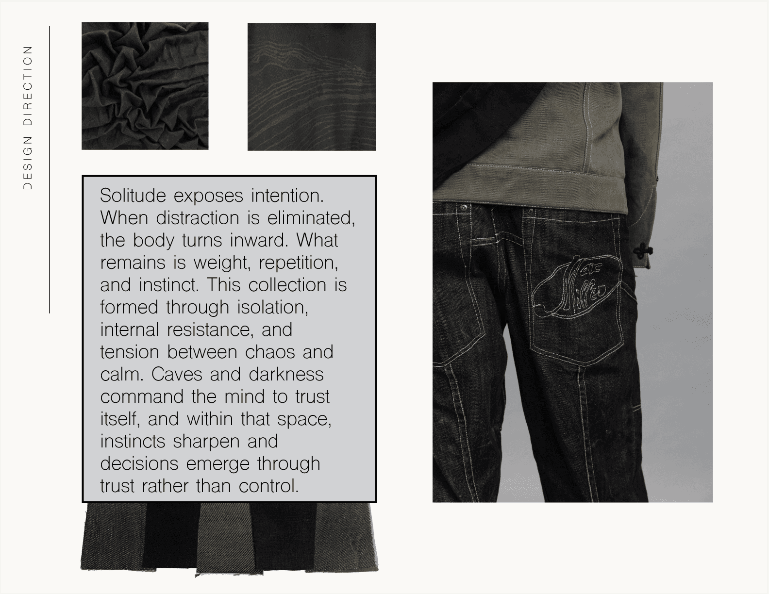 Below the Surface is an exploration of what emerges when distraction is stripped away. Through repetition, weight, and material tension, the work moves between control and collapse, using garment construction as a way to understand form, process, and self.