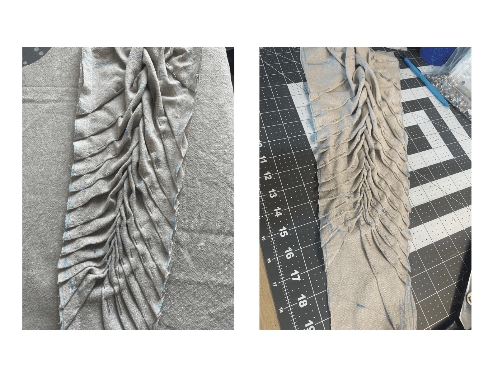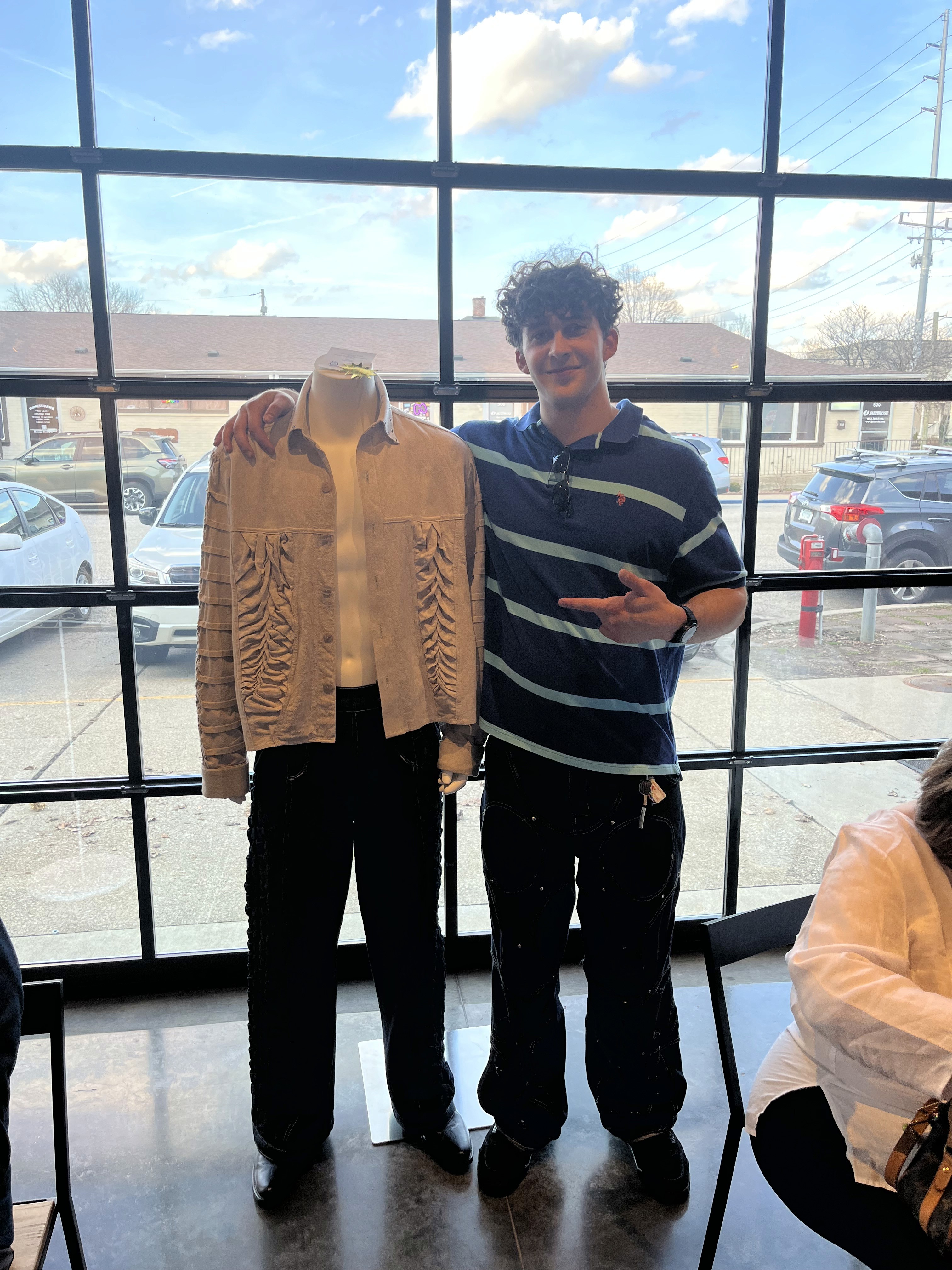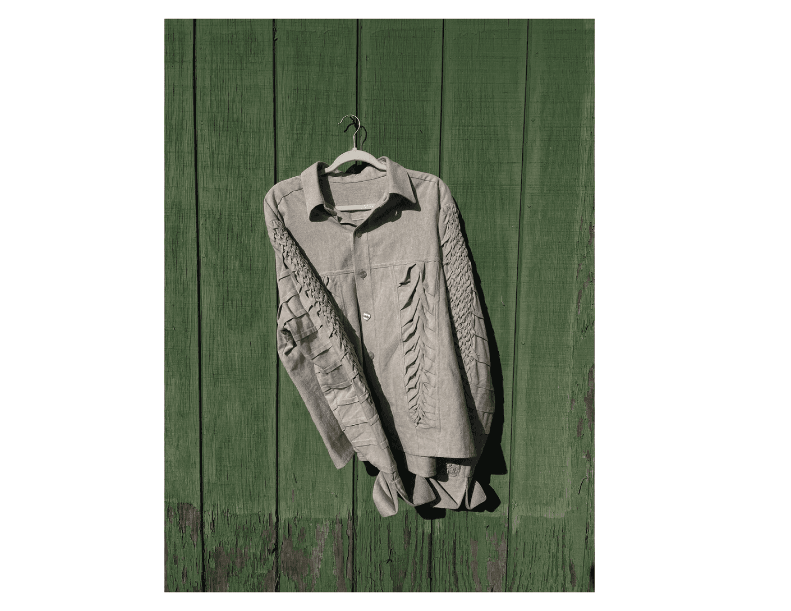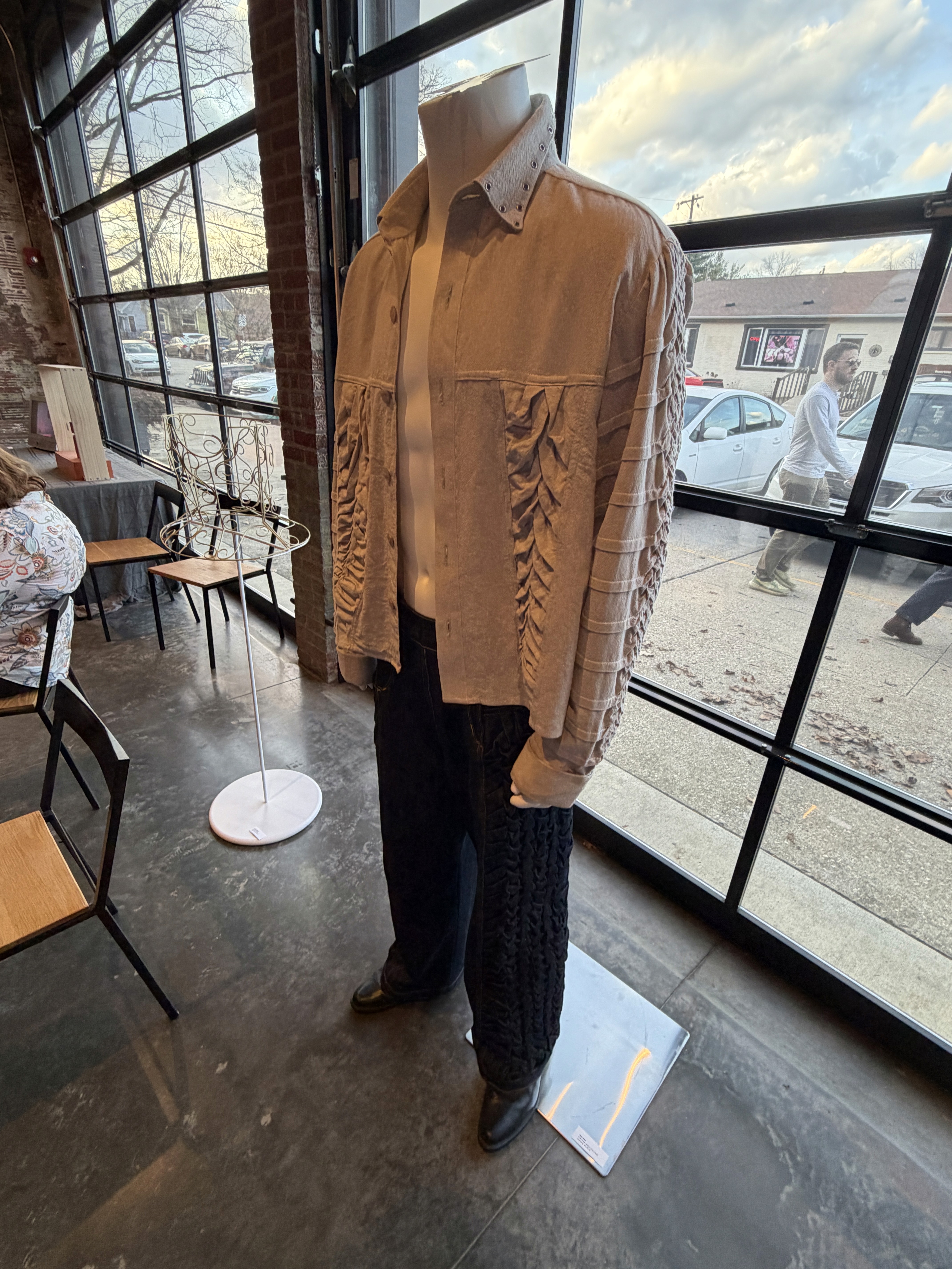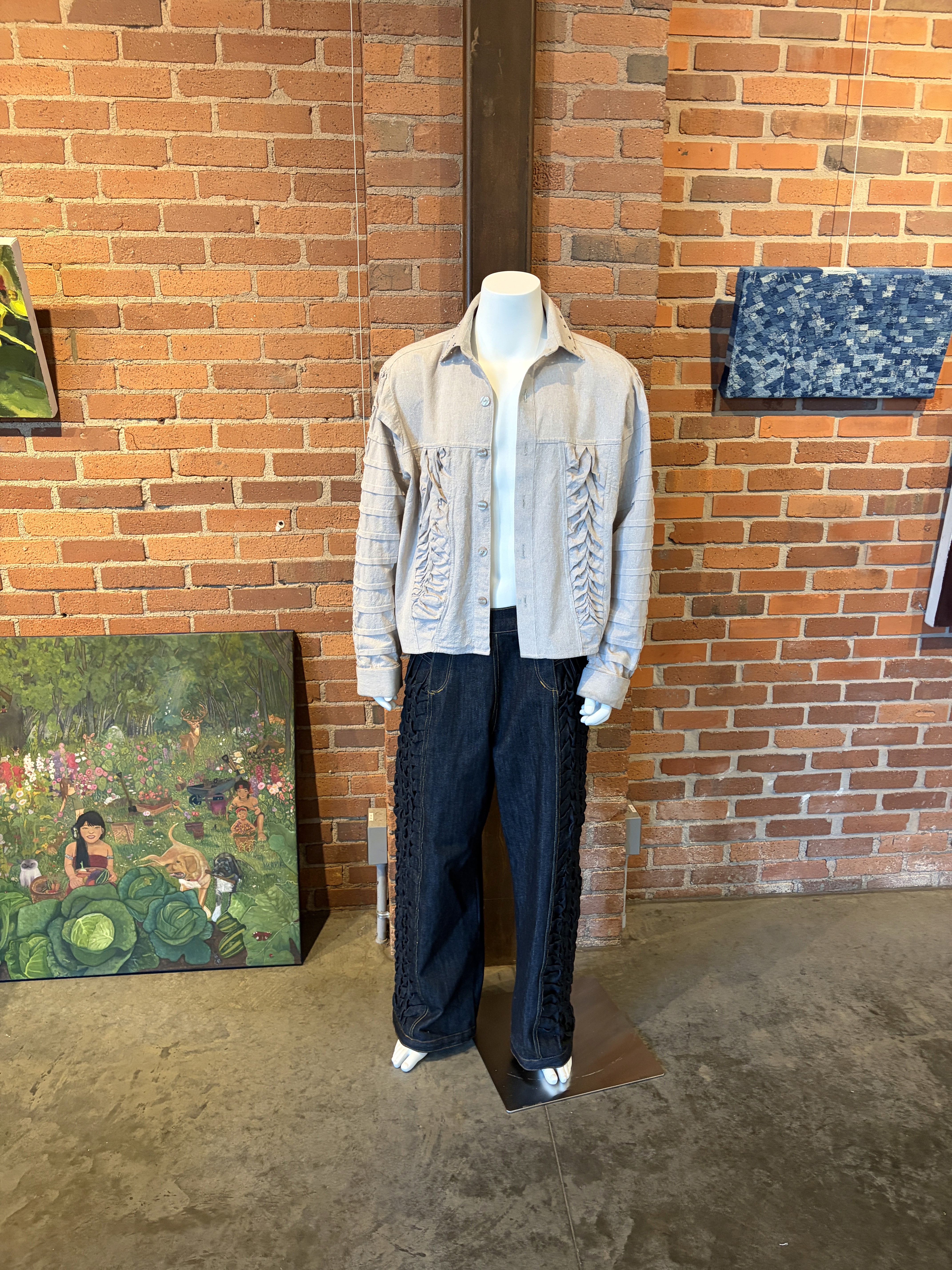 Soft Armour, recipient of the Chapter Career Award at the National Society of Arts and Letters exhibition, explores protection through softness rather than rigidity. The look pairs a linen shirt with smocked denim jeans, using large-scale Canadian smocking to build structure, texture, and controlled volume. The contrast between lightweight linen and structured denim creates a balance of tension and flexibility. The use of time-intensive hand techniques acts as a response to fast fashion, emphasizing durability, intention, and the value of process.